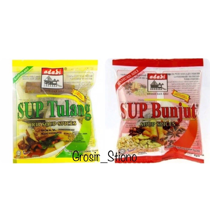 Sop Tulang Adabi dan Sup Bunjut merupakan bumbu rempah tambahan untuk masakan sop tulang, sop daging, dll dengan racikan dan rempah khas yang sangat harum.