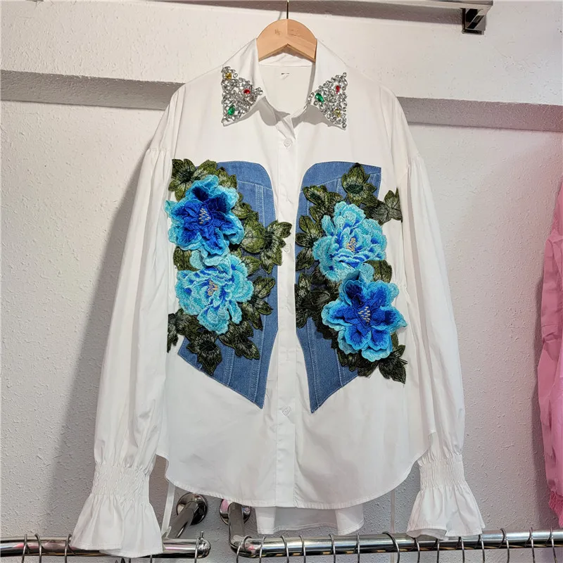 SuperAen дизайнерская Лоскутная джинсовая Укороченная рубашка с длинным рукавом и вышивкой на талии, новинка весны 2024, модная рубашка