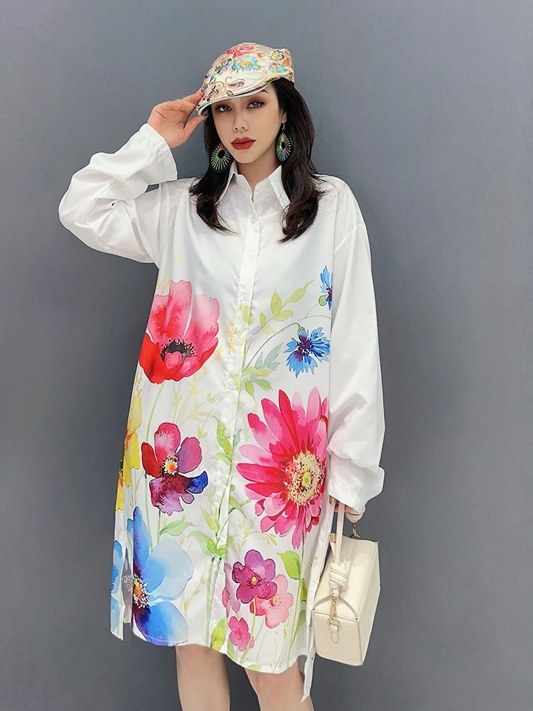 SuperAen 2023 летнее Новое корейское платье-рубашка с отложным воротником и цветочным рисунком, свободное асимметричное модное женское платье-рубашка