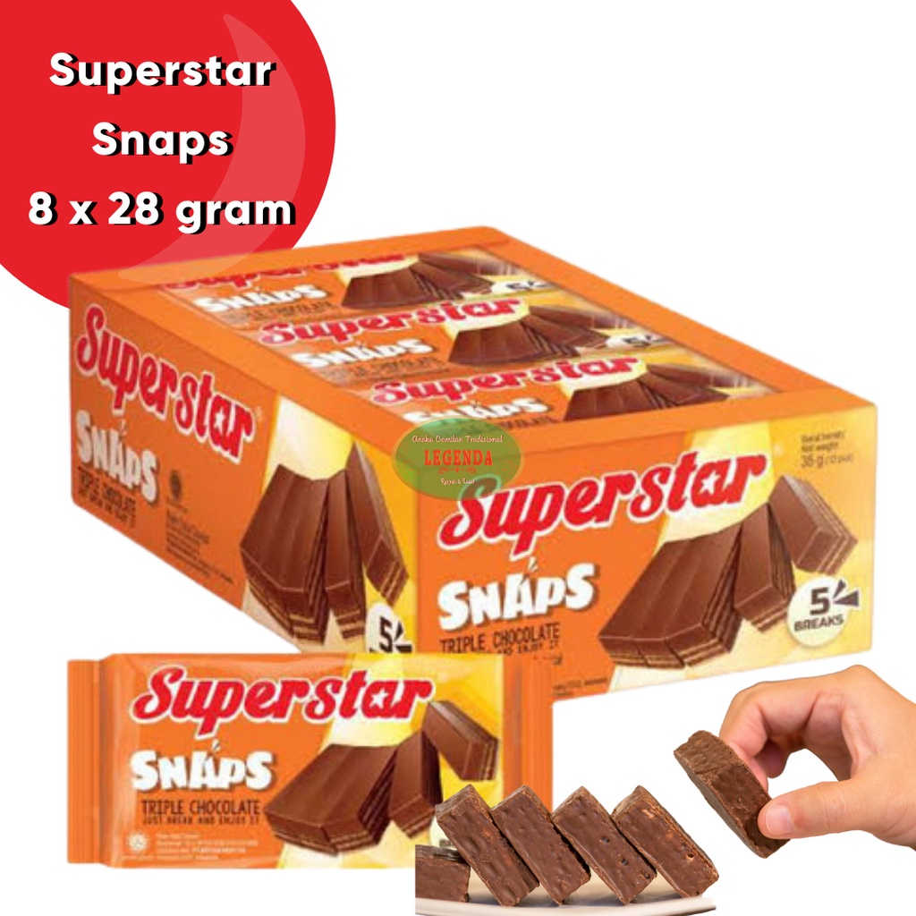 Superstar Snaps12 Pcs @28gr, wafer stick renyah yang memiliki kemurniaan, kelembutan, dan kesempurnaan rasa. Wafer stick ini terdiri dari kombinasi wafer krispi, krim cokelat premium yang nikmat, dan susu lezat di setiap gigitannya, memberikan sensasi menikmati coklat premium yang tak terlupakan. Diproduksi dengan teknologi modern dengan bahan-bahan berkualitas sehingga menghasilkan wafer stick sebagai camilan yang pas dan bermutu baik.