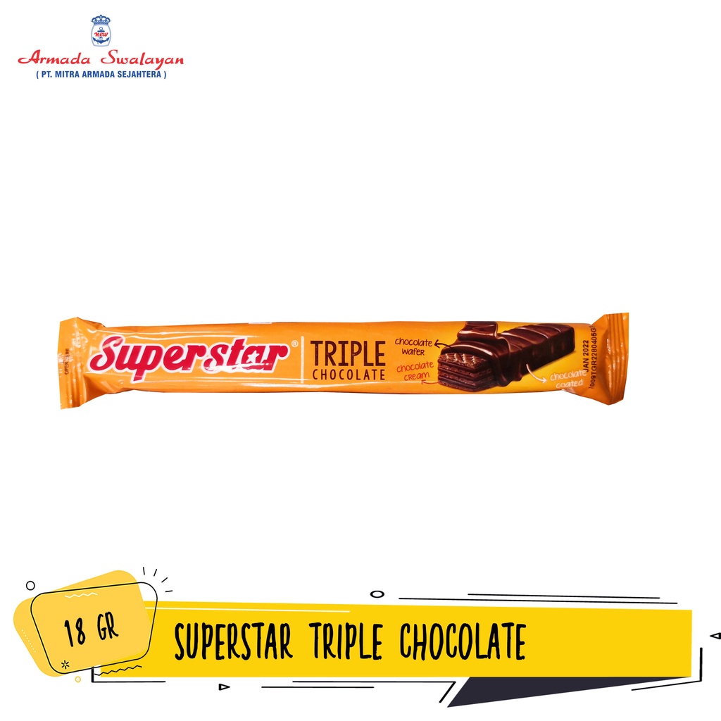 Superstar Triple Chocolate merupakan biskuit wafer dari Superstar rasa cokelat yang enak. Nikmat dimakan untuk menemani aktivitas Anda sehari-hari. Kombinasi wafer dan cokelatnya menghasilkan rasa yang lezat di setiap gigitan.
