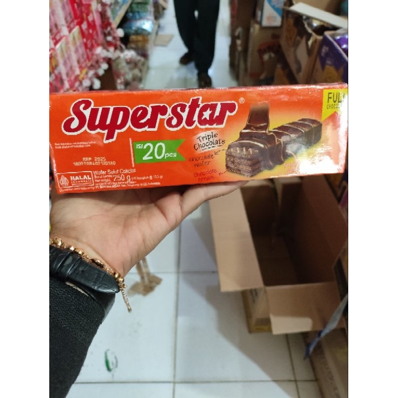 wafer coklat Superstar sudah menjadi jajanan legendaris bagi anak2 di indonesia, wafernya crunchy di lapisi dengan coklat asli yang tebal sangat disukai semua kalangan
