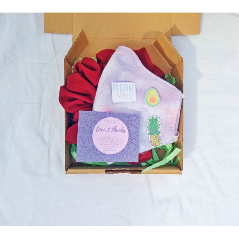 Suprise box yg isinya ada masker tiedye, scrunchie, sticker cute hanya buat kamu