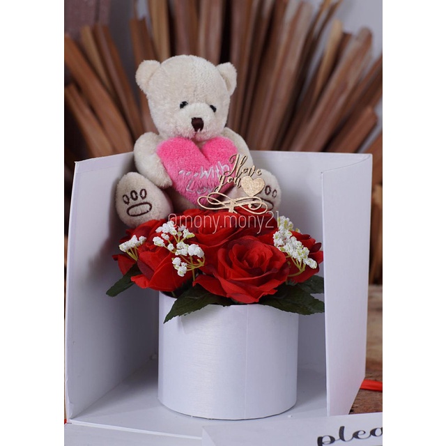 Surprise rangkaian bunga cantik dalam box yang terbelah disertai boneka teddy bear,