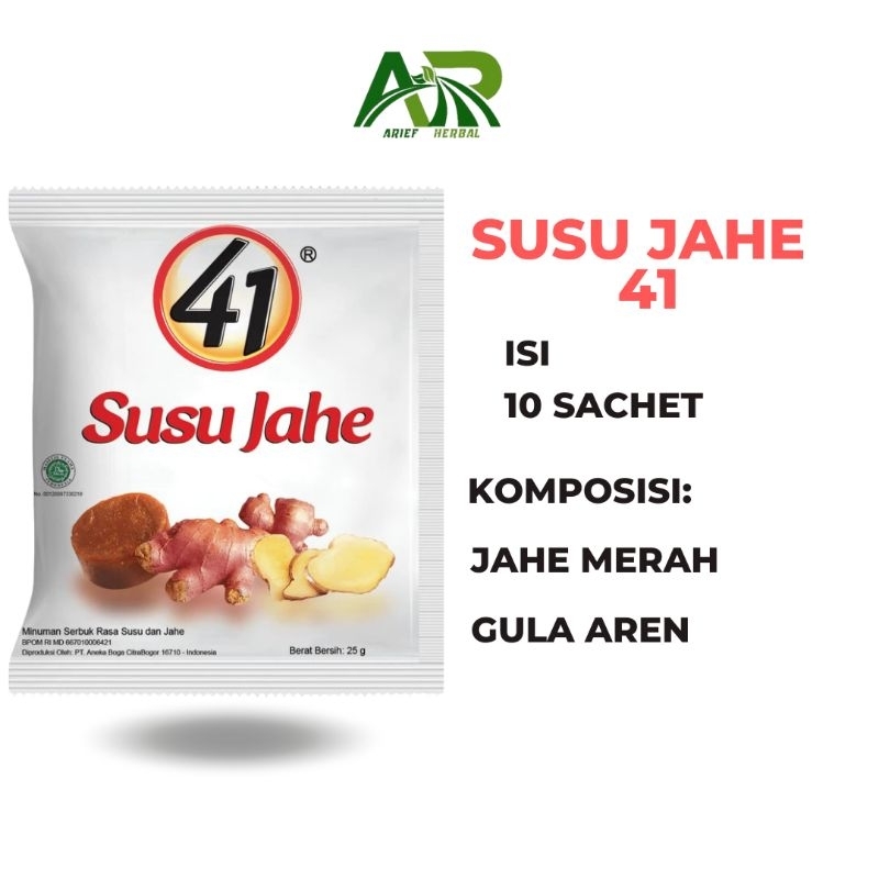 Susu Jahe 41 isi 1 Renceng/10 Sachet @22 Gram/Sachet Susu Jahe 41 adalah Susu jahe instant pertama di Indonesia yang menggunakan jahe merah usia 41 minggu dan gula merah. Susu Jahe 41 diramu secara khusus menggunakan jahe merah pilihan usia 41 minggu, sehingga lebih hangat dan lebih berkhasiat dibandingkan Susu Jahe Instant lainnya.