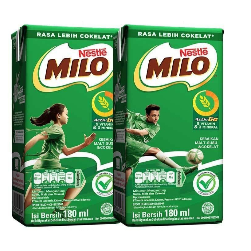 Milo Active-Go merupakan minuman kemasan siap minum yang mengandung susu dan coklat untuk mendukung aktivitas sepanjang hari. Minuman mengandung Protomalt, diperkaya dengan vitamin B1, B2, B3, serta Kalsium dan Fosfor untuk mendukung aktivitas sepanjang hari.