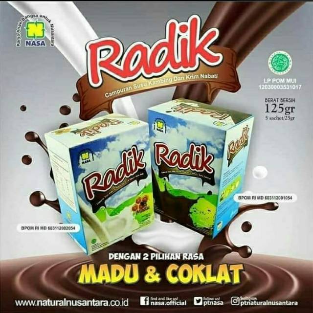 Susu radik merupakan susu kambing etawa dalam bentuk bubuk yang diformulasikan spesial di bandingkan susu kambing etawa bubuk lainnya.