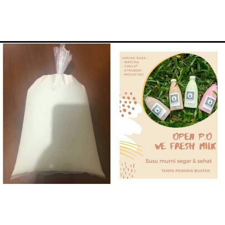 susu sapi murni, asli 100% jaminan tanpa bahan pengawet dan pemanis buatan. ukuran botol 350 ml, tersedia rasa strawberry, mocca, cokelat dan matcha untuk kemasan botol. tersedia kemasan pelastik untuk pembelian 1 liter.