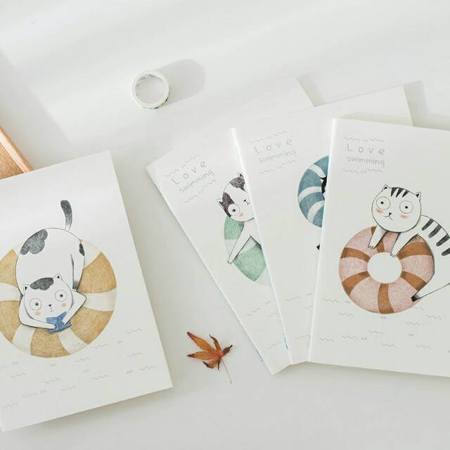 Buku tulis bergaris dengan sampul bertema seekor kucing yang sangat menyukai berenang, sangat lucu dan menggemaskan bukan? Ukurannya yang sedikit lebih besar membuatnya nyaman untuk ditulisi serta setiap lembar kertasnya dijilid dengan jahitan benang agar tidak mudah terlepas.