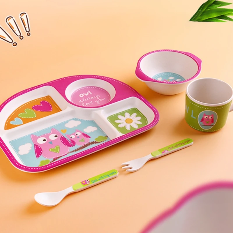 T8ND 5 шт. набор детской посуды из бамбукового волокна, обеденная тарелка + миска + ложка + вилка + Набор чашек для воды