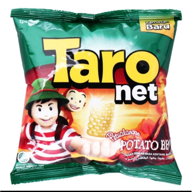 Taro Net, makanan ringan berbentuk seperti jaring. Bernetto 9 gram. Ber BPOM dan Halal MUI.