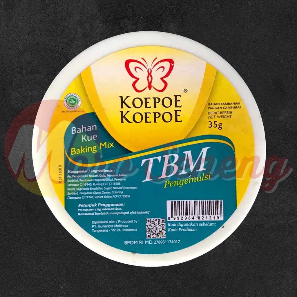 - Kegunaan: Emulsifier dari Koepoe Koepoe ini dapat menstabilkan emulsi antara minyak dan air pada adonan kuemu. Juga membantu melembutkan pori-pori pada kue atau roti. Selain itu juga membuat adonanmu tidak turun saat dikocok dan menghilangkan remah-remah yang sering menempel pada gigi. TBM juga dapat berfungsi memperbaiki tekstur cake menjadi lebih lembut. Biasanya ditambahkan saat pengocokan adonan telur. Penggunaanya sekitar 1 sendok teh untuk 5 butir telur. Bentuknya pasta seperti Ovalett.