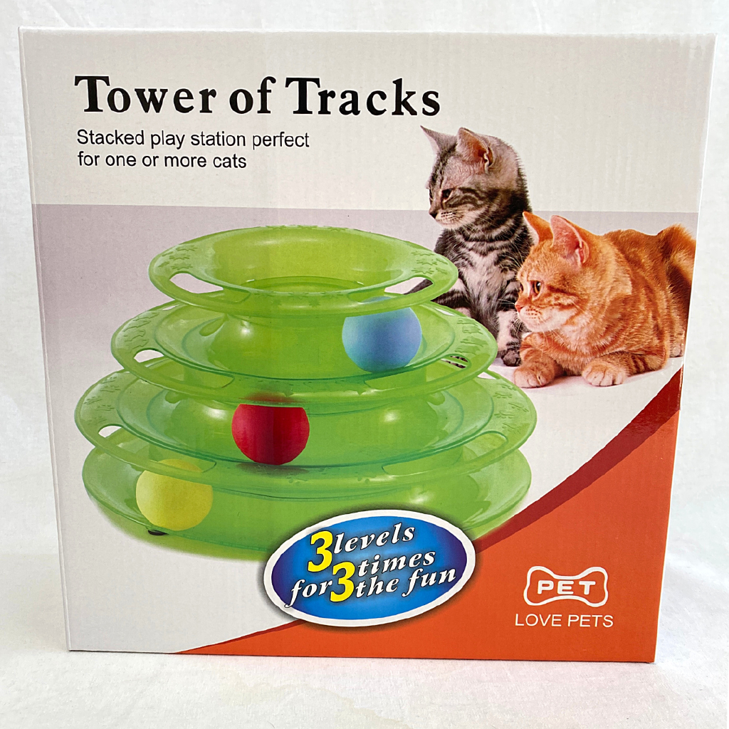Tower of Tracks- Stacked play station perfect for one or more cats-Sturdy construction stands up to vigorous play- Three levels for exciting fun- Ball spin and roll to excite kitty is desire to play- Non-skid pads at bottom Me..Color :- Green- Orange