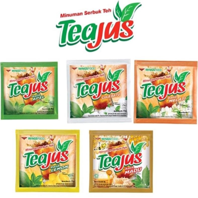 Tea Jus adalah perpaduan antara kenikmatan teh dengan berbagai khasiatnya dengan kesegaran sari buah yang penuh dengan vitamin C yang dibutuhkan tubuh. Produksi PT WingsFood, tersedia dalam 4 rasa yang istimewa yang membuat para pecinta teh begitu menyukainya, yaitu: