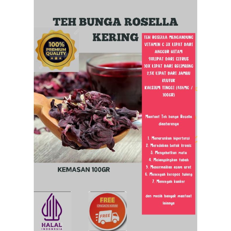 Selain itu juga teh Rosella mengandung KALSIUM tinggi (486mg/100gr), magnesium, Omega 3, iron, Potasium, Beta Karoten dan Asam esensial.
