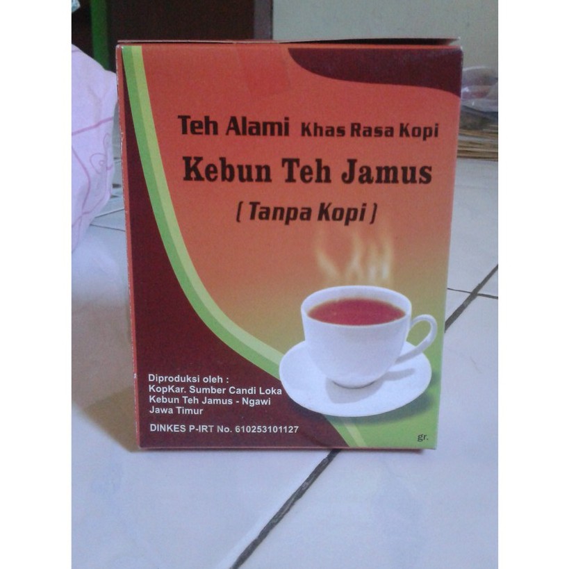 Teh alami khas rasa kopi dari perkebunan teh Jamus Ngawi Jawa Timur. Dipetik dari kebun teh yang berumur lebih dari 100 tahun, dari daun teh pilihan dan diolah secara khusus tanpa menggunakan bahan kimia, sehingga menghasilkan teh dengan aroma dan rasa khas kopi (tanpa campuran kopi). Aman & bisa diminum sebagai terapi untuk penderita diabetes (konsumsi tanpa gula)