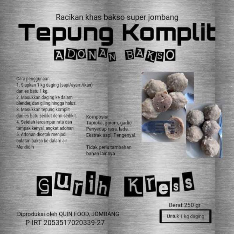 Tepung komplit bakso yang super krek dan kres, dijamin tidak mengecewakan karena sudah teruji, halal dan mendapat izin.