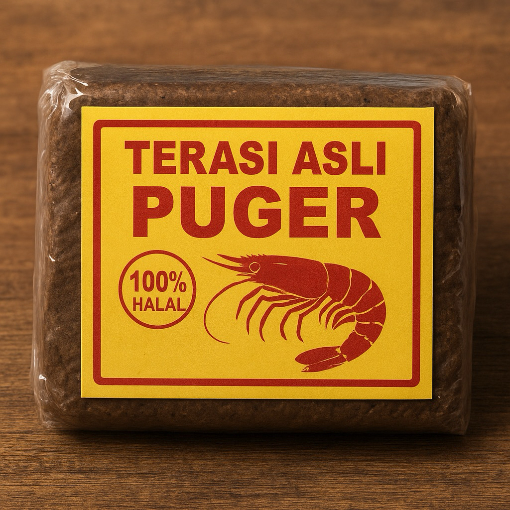 Terasi Asli Puger adalah bumbu tradisional khas Puger, Jember, Jawa Timur, yang dibuat dari udang rebon segar pilihan. Proses pembuatannya masih menggunakan cara tradisional, yaitu udang rebon difermentasi, dijemur di bawah sinar matahari, lalu digiling hingga halus dan dipadatkan. Terasi ini memiliki aroma khas yang kuat, warna cokelat kehitaman alami, dan cita rasa gurih yang menjadi rahasia kelezatan berbagai masakan, seperti sambal terasi, tumisan, hingga sayur berkuah. Terasi Asli Puger dikenal tanpa campuran bahan kimia, tahan lama, dan 100% halal, sehingga aman digunakan untuk masakan sehari-hari.