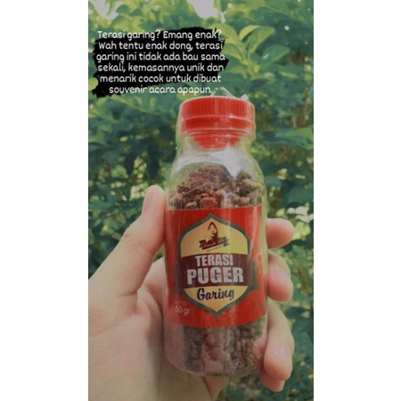 Terasi garing, hasil olahan dari udang rebon yang ditumbuk halus dan keringkan. Olahan ini disangrai dan terakhir di oven hingga bener-benar garing dan busa disimpan bertahun. Tidak berbau , dan ringan seginggan aman dibawa kemana mana. Bentuk kemasannya mini. Bisa dibawa untum oleh-oleh khas daerah.