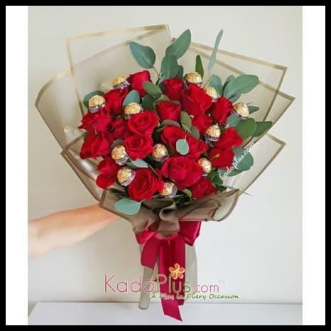 24 stems of stunning red roses, 12 Ferrero Chocolates, with vintage greens wrapped in luxurious golden wrappings.