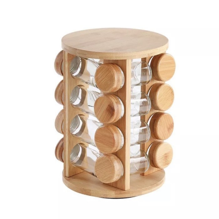 Desain dengan rak bahan kayu bambu dan dapat diputar sehingga memudahkan kita untuk mengambil botol bumbu.