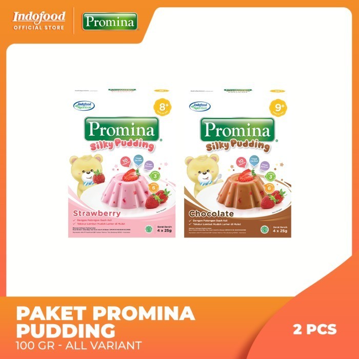 Promina Silky Pudding adalah Puding khusus bayi dengan tekstur lembut dan potongan buah asli. Promina Puding kaya akan susu sehingga tinggi kalsium cocok untuk bayi 8 bulan keatas. Promina Puding terdiri dari 2 varian rasa yaitu coklat dan strawberry.