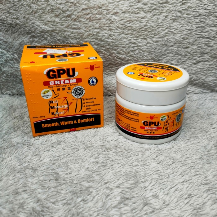 GPU Krim adalah krim pertama yang bisa untuk gosok bahkan pijat. Hadir dengan formula khusus yang tidak lengket, tidak berminyak dan tidak meninggalkan noda. Dengan tingkat kelicinan yang pas serta mudah diserap oleh kulit, GPU Krim sangat cocok bagi mereka yang menginginkan sensasi pijat GPU yang berbeda. Dengan 3 pilihan aroma khas yaitu minyak jahe, minyak sereh dan minyak pala, GPU Krim berkhasiat untuk membantu meredakan pegal linu, nyeri sendi, sakit pinggang, keseleo, memar dan memperlancar peredaran darah. GPU Krim tersedia dalam 3 ukuran yaitu 60 gram, 150 gram dan 250 gram.
