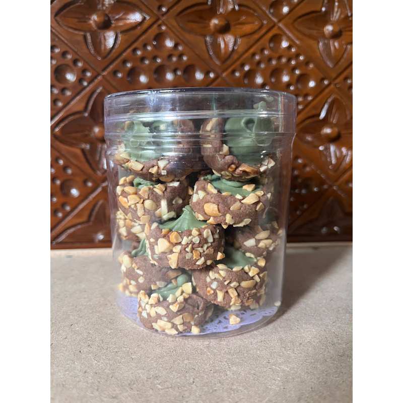 Merupakan choconut thumbprint dengan pasta pistahio yang enak. Dikemas dalam toples silinder ukuran 600gram.