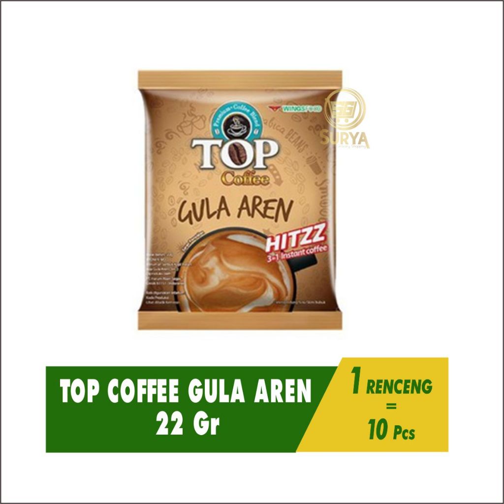 TOP COFFEE GULA AREN 3 in 1 Instant Coffee, kopi kekinian dari perpaduan biji kopi pilihan dengan rasa gula aren yang legit dan susu. Kalau dari segi rasa, nikmat dan berkualitas