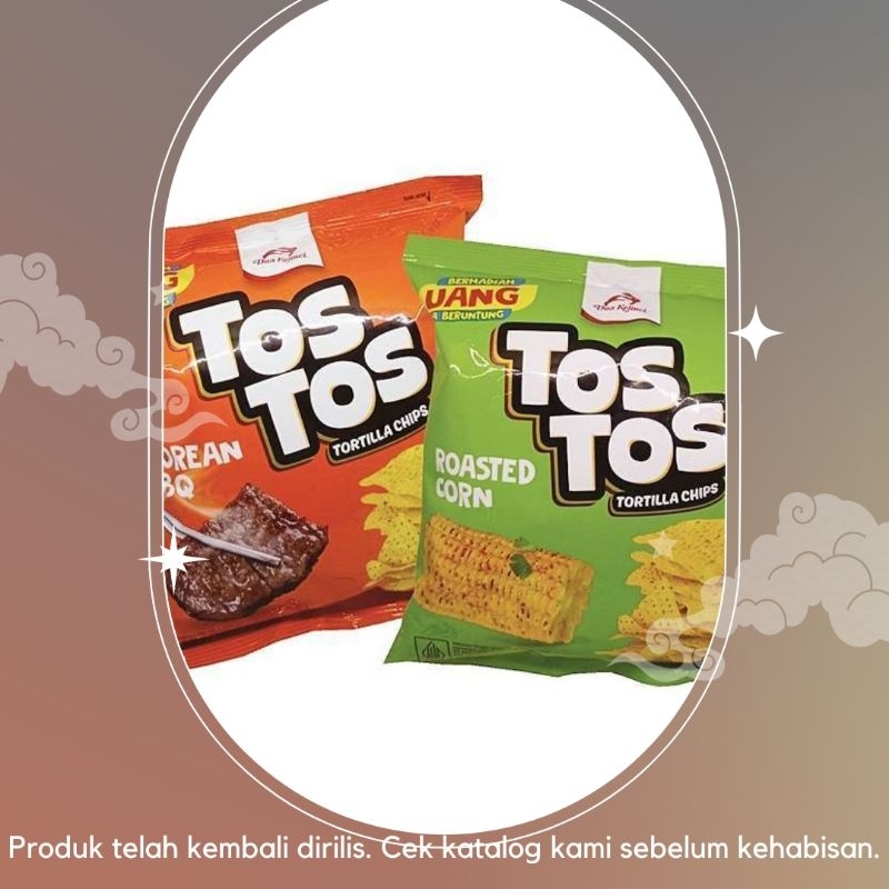 TOS TOS Merupakan camilan berupa keripik yang terbuat dari jagung asli pilihan berkualitas dan bermutu. Diproses dengan teknologi tinggi, dan dikombinasikan dengan rasa nacho cheese yang istimewa sehingga menghasilkan paduan rasa yang enak, gurih dan renyah. Camilan ini cocok menjadi camilan saat Anda sedang bersantai