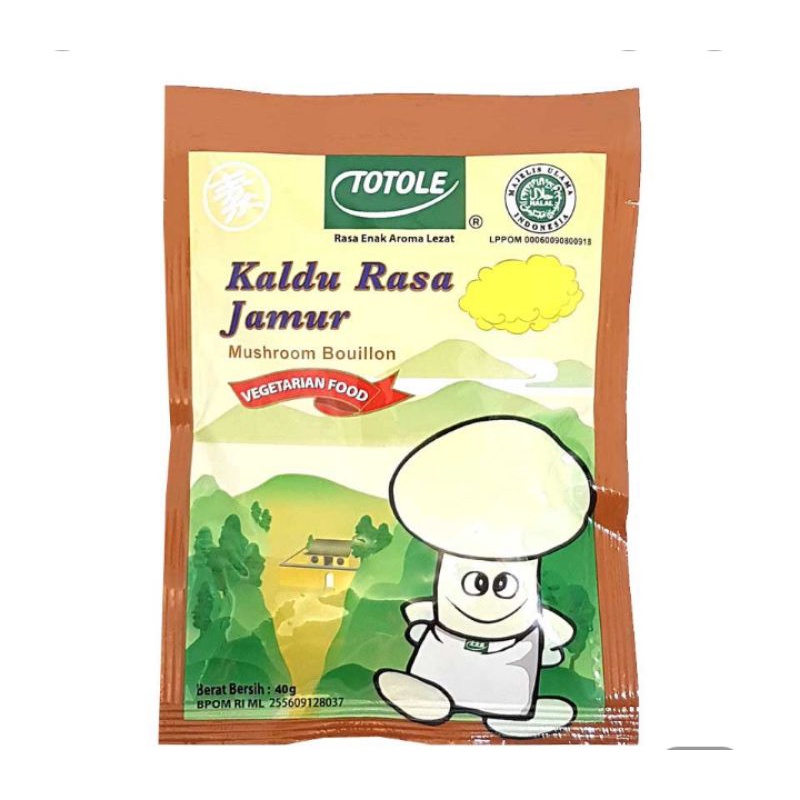 TOTOLE Kaldu Rasa Jamur 40 g adalah bumbu penyedap masakan yang membuat cita rasa masakan anda akan menjadi semakin lebih lezat dan gurih. Cocok untuk yang vegetarian karena tidak mengandung bahan-bahan hewani. Tersedia dalam kemasan sachet isi 40 g.
