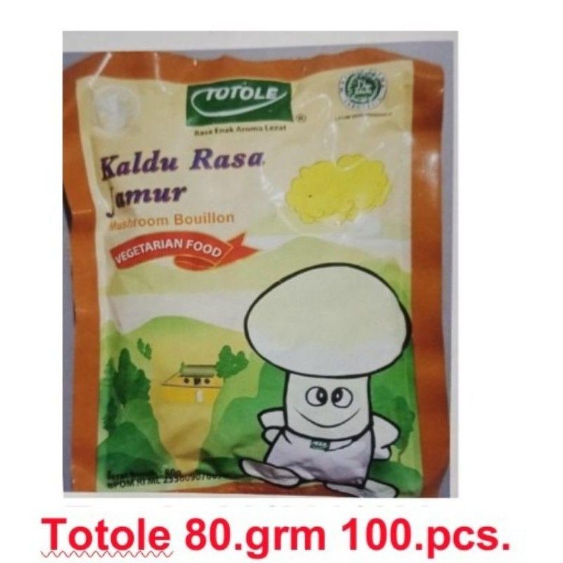 Description. Totole merupakan kaldu jamur pengganti penyedap rasa yang berada dipasaran saat ini. Kaldu jamur ini tidak mengandung MSG, bebas dari kandungan hewani dan telah mendapatkan sertifikasi halal walaupun ini merupakan produk import.