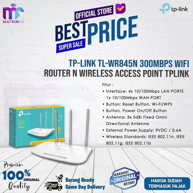 TP-LINK TL-WR845N adalah Wireless N Router yang merupakan kombinasi dari Network Wired dan Wireless untuk menghubungan perangkat Anda dengan Internet, yang terdiri dari 4 Port Switch. Dengan mengadopsi teknologi terkini MIMO (Multi Input Multi Output) secara bersamaan dapat berkerja melalui 3 antena dalam mengirim (Tx) dan meneriama (Rx) untuk mengatasi interferensi dan degradasi ketika melalui jarak yang jauh ataupun ketika melewati penghalang fisik. Hasilnya sangat luar biasa peningkatan performa dari wireless ini. Sekarang ini Anda dapat menikmati berbagai macam aplikasi yang memakan Bandwidth cukup besar seperti HD Video Streaming secara wireless tanpa menggunakan teknologi WiFi 802.11g lagi, dari manapun di dalam seluruh Rumah atau Halaman Anda dengan menggunakan Router ini TP-LINK TL-WR845N.