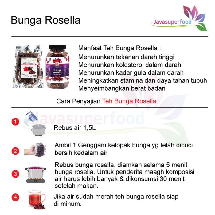 -Manfaat Bunga Rosella Dari java super food adalah Sebagai Antioksidan Tubuh, Meningkatkan Kekebalan Tubuh, Membantu Proses Diet, dan Meremajakan Kulit.