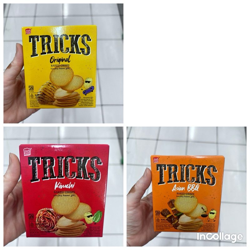 Tricks Crisps Biskuit Kentang Panggang, Snack kentang dengan varian rasa Asia yang khas membuat Tricks menjadi favorit semua kalangan. Dengan rasa Original, Asian BBQ, Kimchi serta Rendang pastinya bikin Anda ketagihan. Ukurannya yang pas dikantong cocok sekali untuk jadi cemilan.
