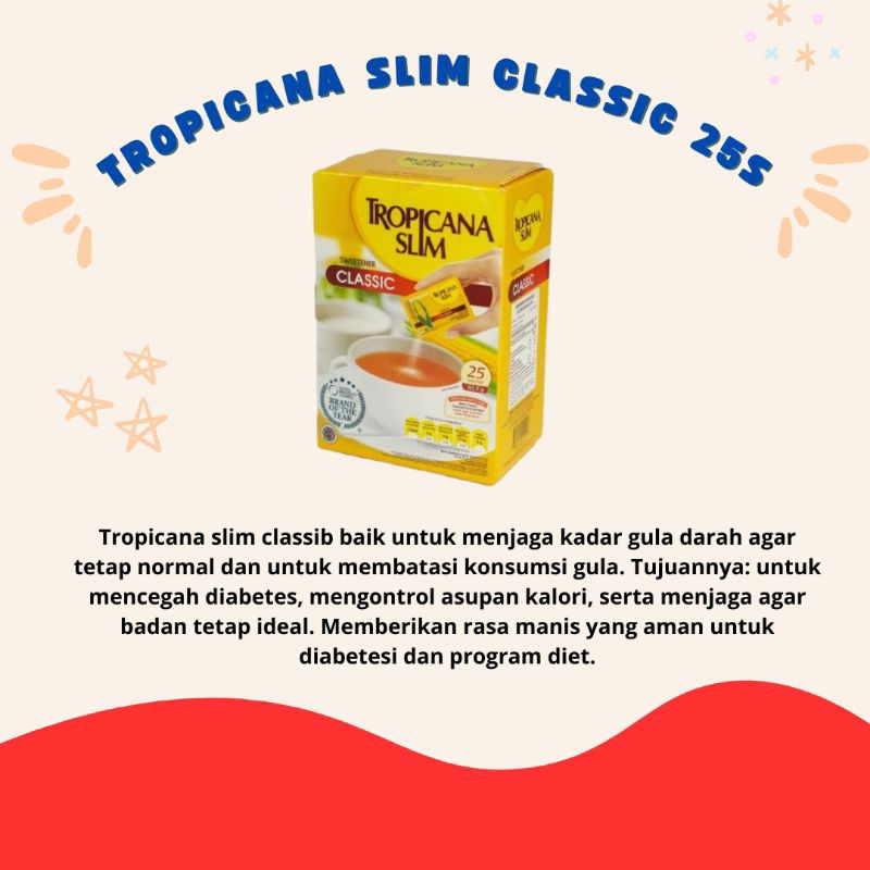 Tropicana Slim Classic adalah pemanis buatan yang bisa digunakan sebagai pengganti gula pasir. Produk ini memiliki beberapa deskripsi, di antaranya: