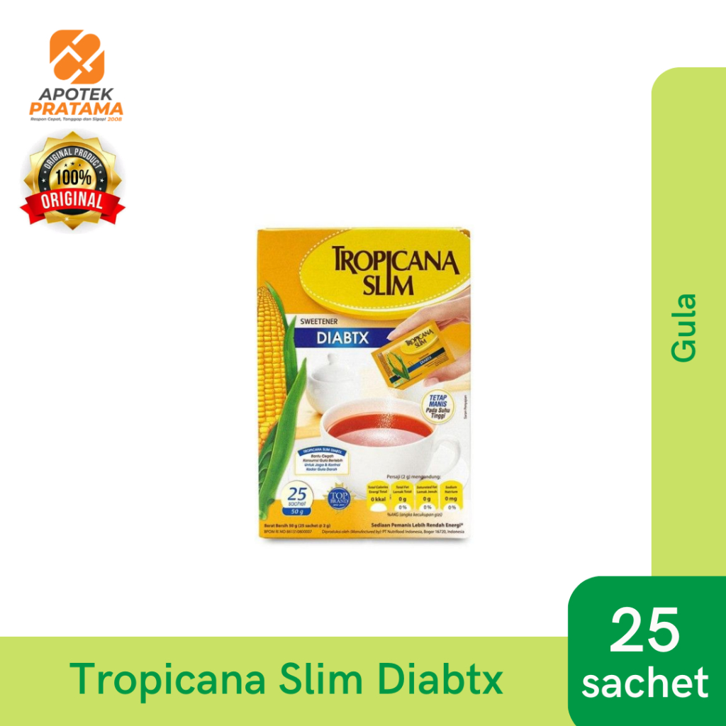 KOMPOSISI : per sachet : pemanis sorbitol 1,97 g;pemanis buatan sukralosa 9,8 mg (ADI:15mg/kg berat badan), pemanis buatan asesulfam 8 mg (ADI : 15 mg/kg berat badan/hari), bubuk jagung, dan kromium pikolinat