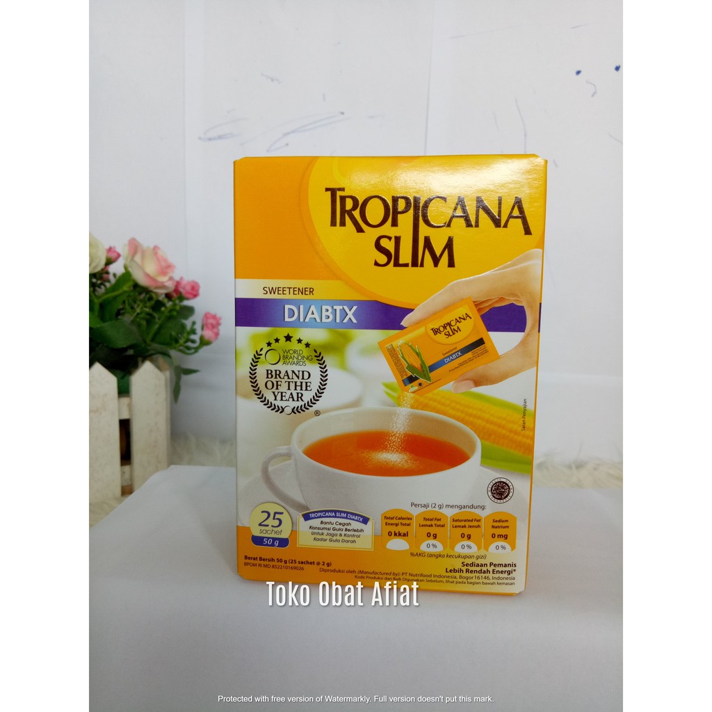 Tropicana slim Diabtx mengandung pemanis alami dan pemanis buatan yang baik untuk penderita diabetes atau orang yang sedang diet gula, produk ini membantu mencegah konsumsi gula berlebih untuk jaga dan kontrol kadar gula dalam darah. satu sachet tropicana slim diabtx setara dengan 2 sendok teh gula pasir. produk ini cocok untuk penderita diabetes atau orang yang membutuhkan makanan berkalori rendah.