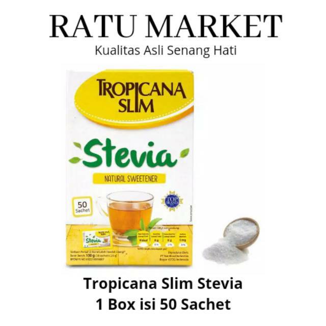 Tambahkan 1-2 sachet Tropicana Slim Stevia sebagai pengganti gula pasir, dalam minuman Anda. 1 sachet (2.5 gram) Tropicana Slim Stevia setara dengan 2 sendok teh (10 gram) gula pasir.