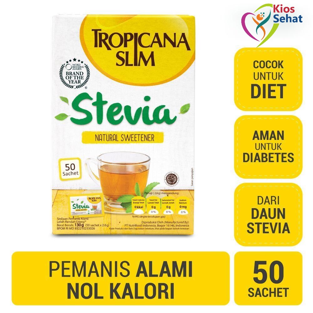 * Tropicana Slim Stevia merupakan salah satu produk terbaru dari Tropicana Slim. Anda dapat merasakan manisnya Tropicana Slim Stevia yang berasal dari tanaman Stevia yang sudah sering digunakan sebagai gula rendah kalori di Jepang. Selain bebas gula produk ini juga nol kalori sehingga cocok dikonsumsi untuk mendukung program diet rendah kalori Anda dan mencegah penyakit diabetes. Dengan kandungan nol kalori, Tropicana Slim Stevia ini dapat memberikan rasa manis yang sehat untuk berbagai jenis minuman Anda