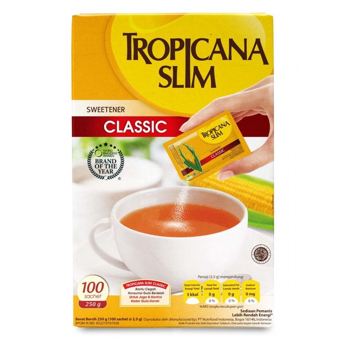 Tropicana Slim Sweetener adalah pemanis rendah kalori yang dapat digunakan untuk berbagai jenis minuman (kopi, teh, jus) Memiliki rasa manis seperti gula sehingga dapat digunakan sebagai pengganti gula pasir yang sesuai bagi diet dan diabetesi.