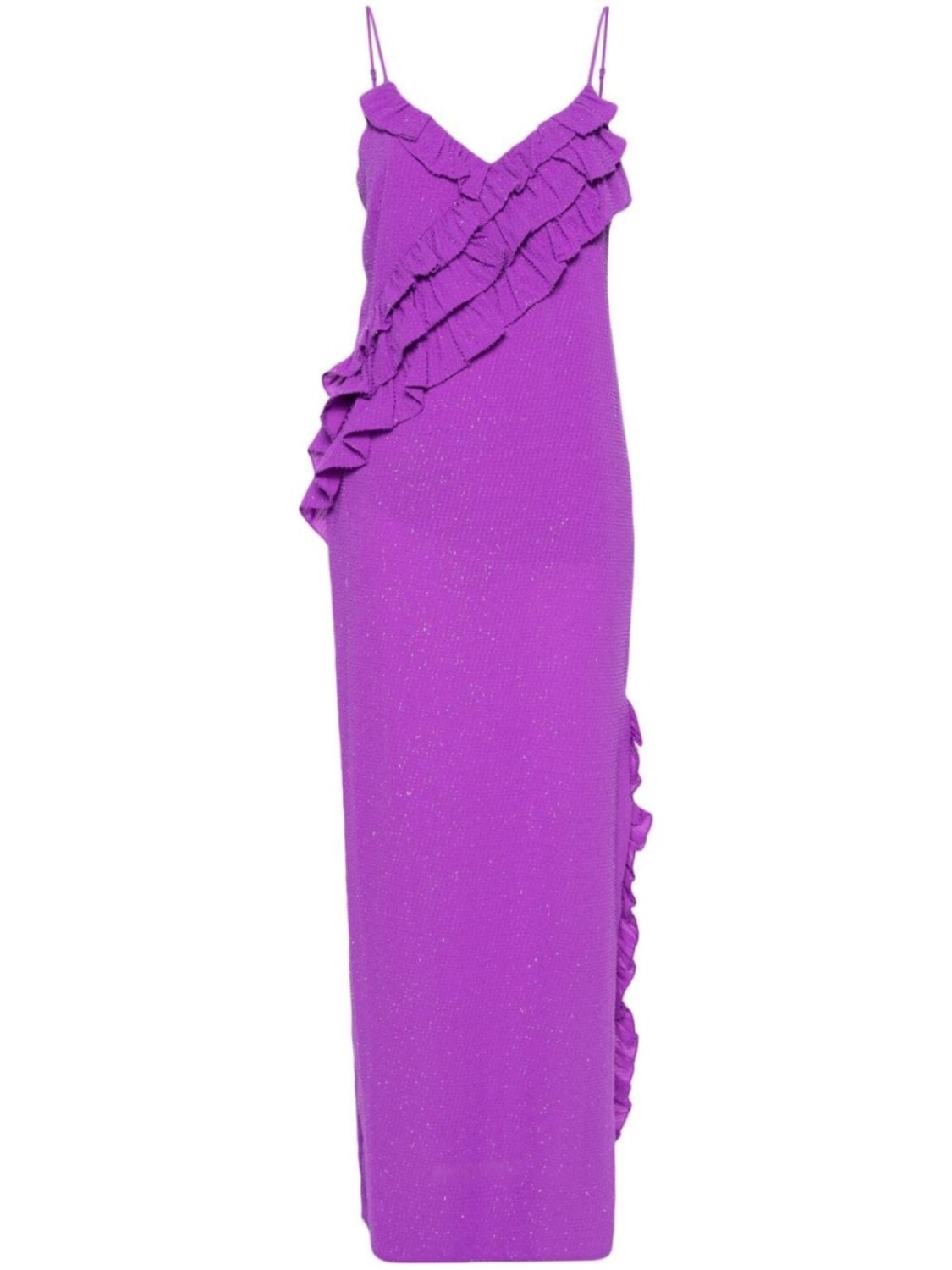 Подробнее о товаре: • темно-фиолетовый • креповая текстура • отделка в технике fil-coupé • защипы • деталь с блестками • оборки на воротнике • серебристый металлический логотип сзади • V-образный вырез • регулируемые тонкие бретели • без рукавов • боковой разрез • прямой подол • частичная подкладка