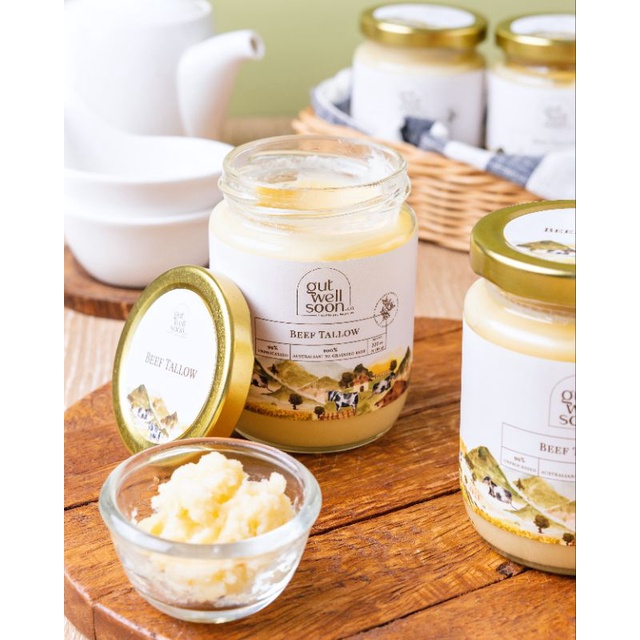 Tallow by Gut Well Soon dibuat dengan menggunakan 100% lemak sapi Australia (HALAL) yang diberi makan rumput serta dibesarkan di padang rumput.