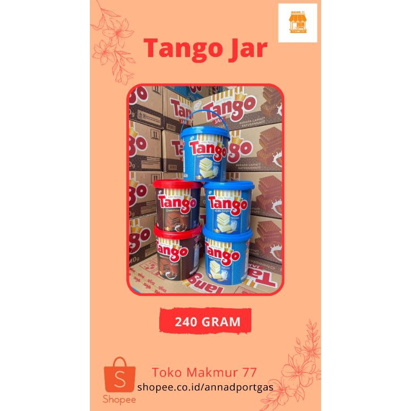 Tango Jar 240 gram adalah wafer yang dikemas dalam toples dengan berat bersih 240 gram. Wafer ini tersedia dalam berbagai varian rasa, seperti cokelat dan vanila.