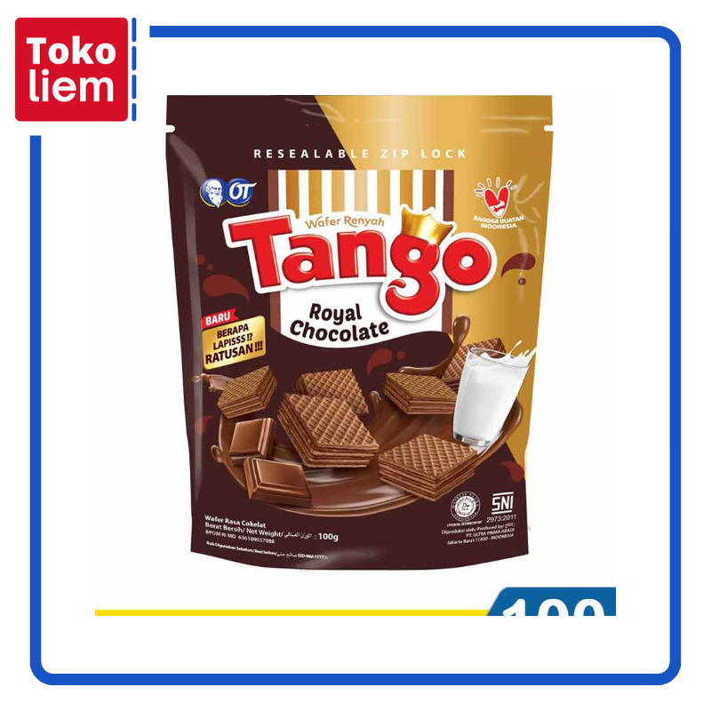 Tango wafer rasa cokelat pouch 115g Komposisi : Tepung terigu (42,9g), gula, lemak reroti (mengandung antioksidan askorbil palmitat & tokoferol), minyak nabati (mengandung antioksidan TBHQ), kakao bubuk (3,2%), susu bubuk full cream (0,75%), whey bubuk, pengemulsi lesitin kedelai, garam, kakao massa (0,15%), tepung, telur, pengembang (amonium bikarbonat & natrium bikarbonat), perisa sintetik cokelat, lemak kakao, perisa sintetik vanila Other Details : Resealable zip lock Takaran Per Kemasan : Sajian per kemasan: 4 Takaran Per Serving : Energi total 150kkal, energi dari lemak 50kkal, lemak total 6g, lemak jenuh 2g, lemak trans 0g, kolesterol 0mg, protein 2g, karbohidrat total 22g, serat pangan 1g, gula 8g, natrium 75mg, kalium 120mg, vitamin A 0%, vitamin C 0%, kalsium 4%, zat besi 10% Takaran Saji : Takaran saji: 31g