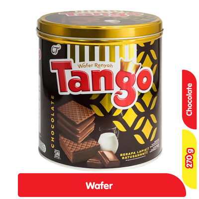 Tango Wafer Chocolate adalah sebuah makanan ringan berupa wafer renyah rasa cokelat. Dibuat dari bahan dasar berupa tepung gandum dan susu pilihan berkualitas, dan bahan bahan campuran lainya. Diolah secara higienis menggunakan teknologi tinggi sehingga menghasilkan biskuit wafer yang nikmat. Biskuit wafer dengan tekstur wafer yang renyah, berpadu dengan krim cokelat nikmat yang berasal dari bubuk kokoa dengan mutu tinggi. Dibuat dengan bentuk balok yang terdiri dari empat lapisan wafer dan krim cokelat pada setiap potongannya. Ukurannya yang pas dan tebal, memberikan kenikmatan dan kemudahan saat dimakan. Dikemas menggunakan kemasan tabung kaleng, sehingga kualitas wafer selalu terjaga. Cocok dijadikan cemilan bersama atau makanan pendamping saat minum teh atau kopi. Segera beli Tango Wafer Chocolate dan nikmati kelezatannya.