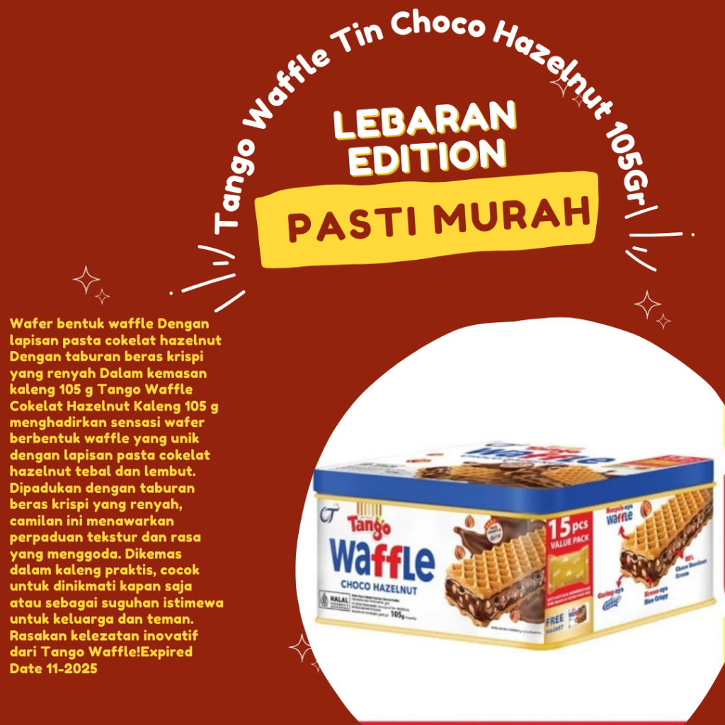 Tango Waffle Cokelat Hazelnut Kaleng 105 g menghadirkan sensasi wafer berbentuk waffle yang unik dengan lapisan pasta cokelat hazelnut tebal dan lembut. Dipadukan dengan taburan beras krispi yang renyah, camilan ini menawarkan perpaduan tekstur dan rasa yang menggoda. Dikemas dalam kaleng praktis, cocok untuk dinikmati kapan saja atau sebagai suguhan istimewa untuk keluarga dan teman. Rasakan kelezatan inovatif dari Tango Waffle!