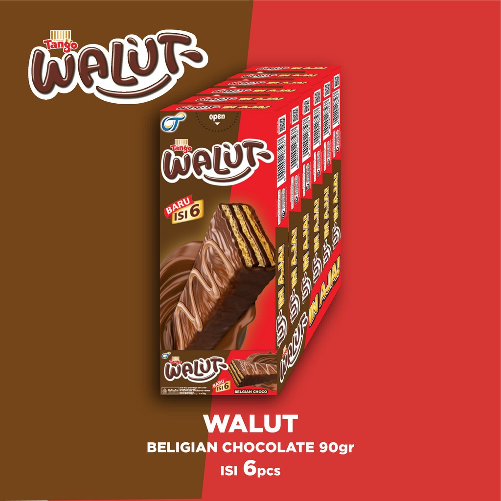 Tango Walut Belgian Choco dengan kerenyahan 3 lapis wafer dengan krim coklat khas belgian tebal, disalut dengan coklat diatasnya yang memberikan sensasi nikmat dan nagih dalam setiap gigitan