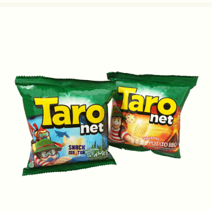 Taro Net, makanan ringan berbentuk seperti jaring. Bernetto 9 gram. Ber BPOM dan Halal MUI.