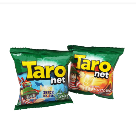 Taro Net, makanan ringan berbentuk seperti jaring. Bernetto 9 gram. Ber BPOM dan Halal MUI.
